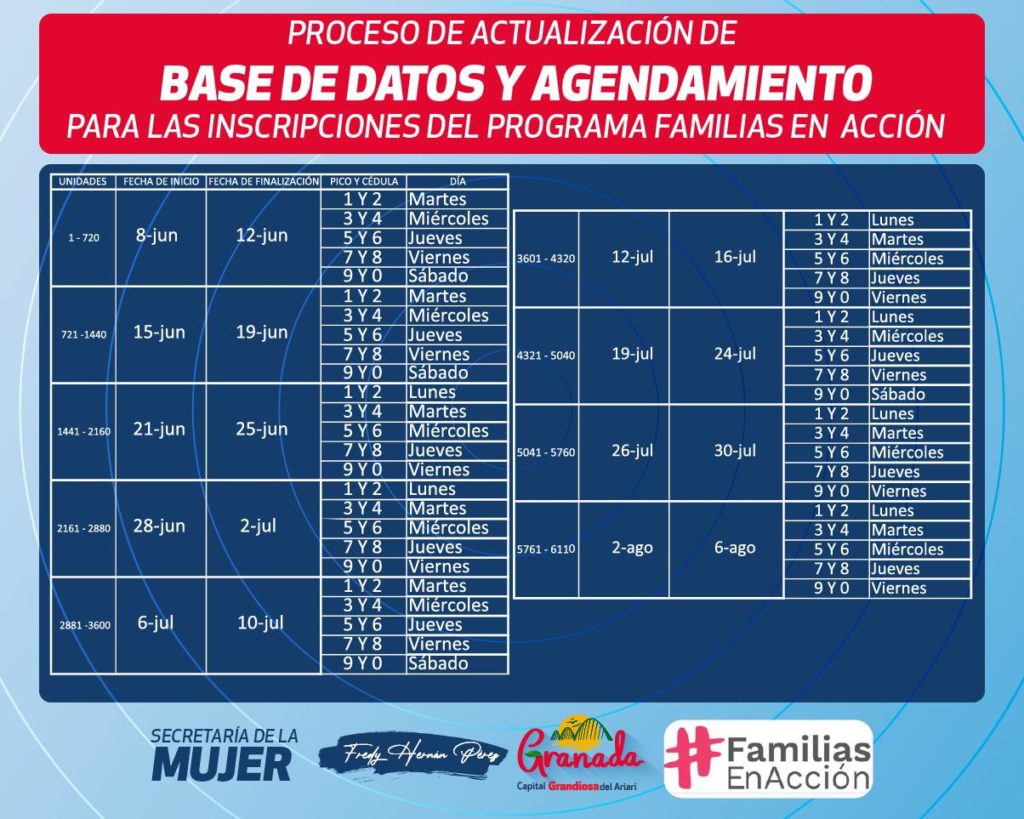 Luego de la gestión realizada por el alcalde de Granada Fredy Hernán Pérez, el Gobierno nacional anunció que se amplía el cupo de beneficiarios del programa Familias en Acción, el cual llegará a 6.110 nuevos núcleos que se beneficiarán con este apoyo económico en ese municipio.